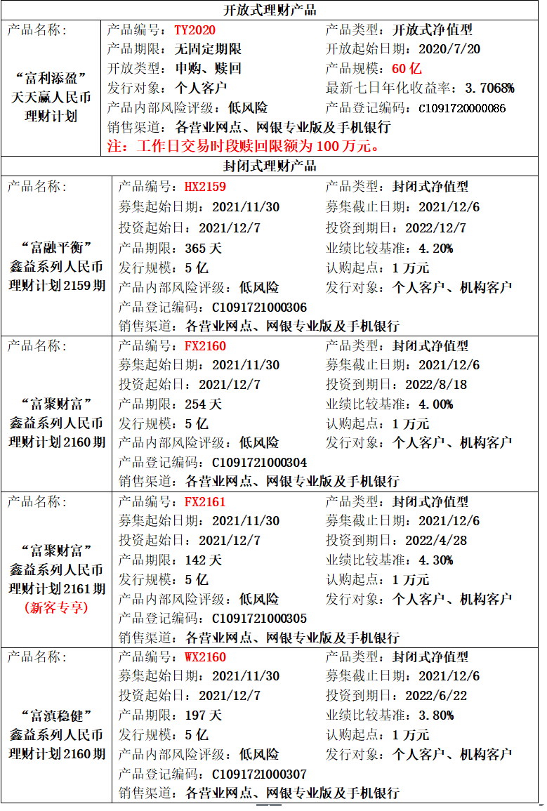 我行2021年11月29日-2021年12月3日理财产品发行计划公布如下,供您参考,欢迎致电富滇银行客户服务热线(0871-96533)或富滇银行各营业网点了解详情。