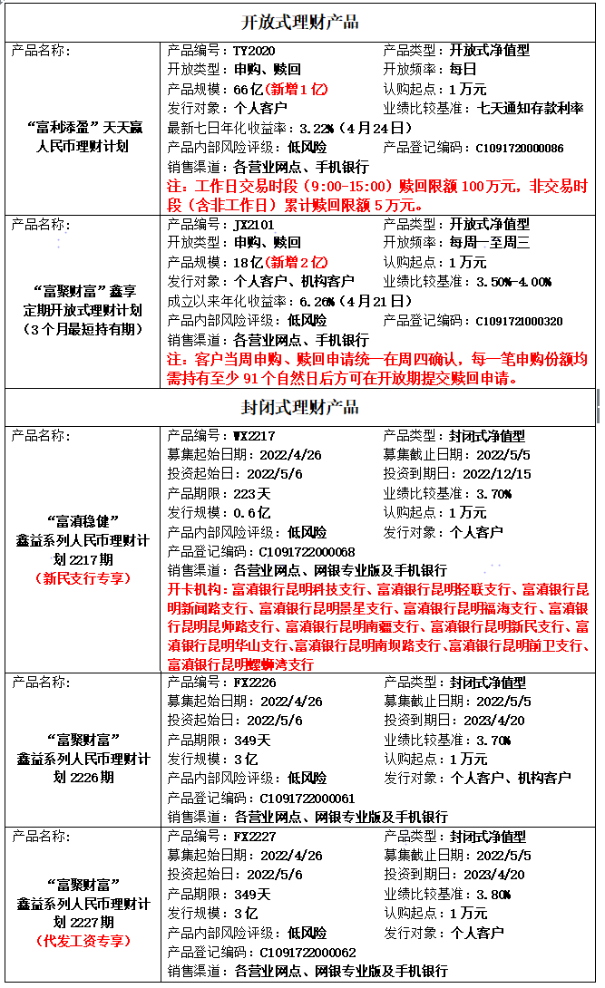 我行2022年4月25日-2022年4月29日理财产品发行计划公布如下,供您参考,欢迎致电富滇银行客户服务热线(0871-96533)或富滇银行各营业网点了解详情。