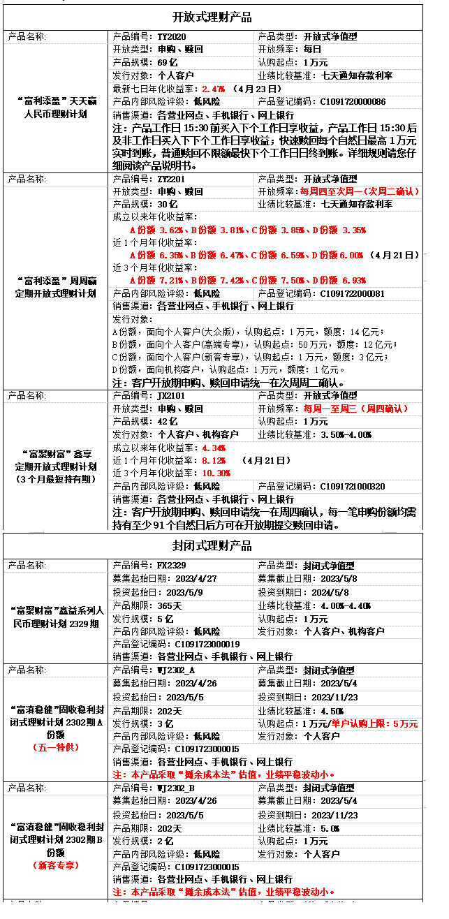 “富银理财”人民币理财产品发行公告(2023.4.24-2023.4.28)